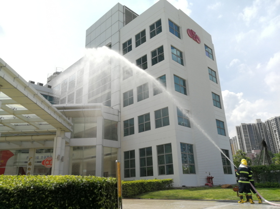 伴隨著演練工作人員各就各位后,演練項目總指揮孫維廣董事長的一聲令下:“開始演練”拉開了演練的序幕。工作人員用對講機向各工作組傳達演練開始,辦公樓樓三樓外平臺及天臺上開始冒起了“濃煙”,大樓內(nèi)響起消防警鈴聲,消防廣播開始播音通知,通知大樓內(nèi)所有員工開始緊急疏散。由各樓層的疏散組成員馬上組織本區(qū)域的員工從安全疏散通道快速撤離,將員工安全疏散到指定的空曠安全集結(jié)點集結(jié)清點人數(shù)。各演練工作組也同步展開相應(yīng)工作。保衛(wèi)、通訊組成員立即在主要路口拉開警戒線防止無關(guān)人員車輛進入。滅火組成員分成東、西兩組迅速攜帶消防水帶利用周邊消防栓對火勢進行兩路壓制撲救,救援組也迅速組織了相關(guān)人員帶著擔架,拿好醫(yī)藥箱到集結(jié)點等待救援命令。在義務(wù)消防隊員兩路水槍的奮力撲救下火勢已得到了控制,人員全部疏散完畢,沒有人員受傷。