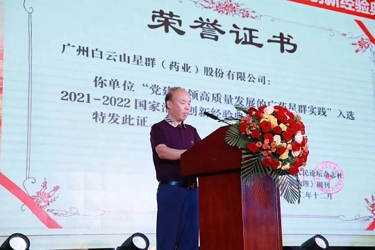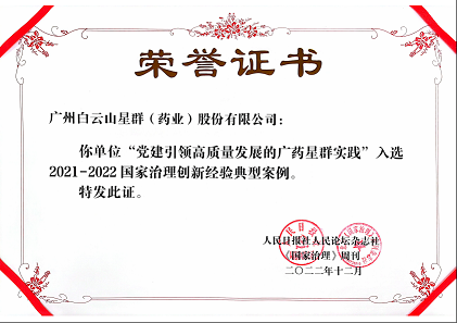 在貫徹落實(shí)廣藥集團(tuán)“123廣藥黨建”創(chuàng)新模式(明確一條主線——大黨建引領(lǐng)企業(yè)大發(fā)展,堅(jiān)持兩個(gè)導(dǎo)向——黨建高標(biāo)準(zhǔn)和發(fā)展高質(zhì)量,強(qiáng)化三大引力——黨的領(lǐng)導(dǎo)力、組織力和創(chuàng)造力)標(biāo)準(zhǔn)的過程中,星群公司在2021年7月百年黨慶之際,探索實(shí)踐出“星火船心”,星群黨委被評(píng)為廣藥集團(tuán)先進(jìn)基層黨組織。在2023年年初,星群黨建創(chuàng)新項(xiàng)目課題《黨建引領(lǐng)高質(zhì)量發(fā)展的廣藥星群實(shí)踐》,從全國(guó)7000多項(xiàng)案例中脫穎而出,成為廣州市唯一企業(yè)入選《中國(guó)式現(xiàn)代化的生動(dòng)實(shí)踐——2021-2022國(guó)家治理創(chuàng)新經(jīng)驗(yàn)(黨建創(chuàng)新)典型案例》,這是由人民日?qǐng)?bào)社指導(dǎo)、人民論壇雜志社主辦的“深入學(xué)習(xí)貫徹黨的二十大精神——第八屆國(guó)家治理高峰論壇年會(huì)”評(píng)選并權(quán)威發(fā)布。