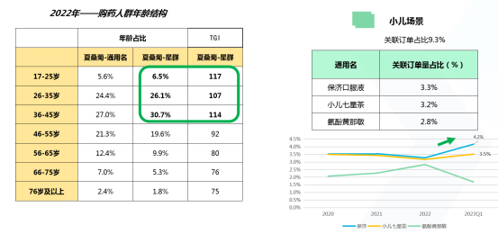 不論點(diǎn)購率還是復(fù)購率都遠(yuǎn)高于其他夏桑菊顆粒品牌,但隱藏在數(shù)據(jù)后更具價(jià)值的是細(xì)分人群的購買偏好。數(shù)據(jù)顯示,2022年購買星群夏桑菊顆粒的主要人群集中在45歲以下,這些人群的重點(diǎn)標(biāo)簽是孩子的父母,中青年家庭健康的決策人。與此同時(shí),從關(guān)聯(lián)訂單可看出,與小兒品類保濟(jì)口服液、小兒七星茶、氨酚黃那敏聯(lián)合購買,意味著兒童用藥場(chǎng)景需求強(qiáng)勁。