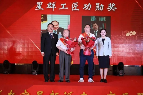 為星群工匠功勛獎(jiǎng)獲獎(jiǎng)?wù)撸涸S招懂(左二)頒獎(jiǎng)