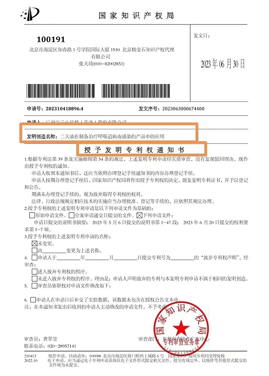 近日,白云山星群與中國中醫(yī)科學院合作項目所申請的專利“二天油在制備治療呼吸道病毒感染的產(chǎn)品中的應用(ZL202310418896.4)”獲國家知識產(chǎn)權局授權。