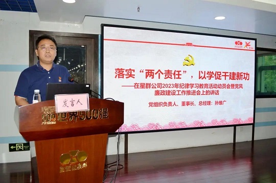 隨后,孫維廣董事長(zhǎng)以“落實(shí)‘兩個(gè)責(zé)任’,以學(xué)促干建新功”為主題講授專題黨課。他從健全制度、認(rèn)真推進(jìn)主題教育、抓黨建促發(fā)展、落實(shí)巡審結(jié)合整改、開展紀(jì)檢干部教育整頓、加強(qiáng)對(duì)三重一大及專項(xiàng)監(jiān)督檢查等六個(gè)方面全面回顧了2023年以來(lái)星群公司加強(qiáng)從嚴(yán)治黨、黨風(fēng)廉政建設(shè)各項(xiàng)工作的落實(shí)情況,并對(duì)下一步工作提出六點(diǎn)要求:一是進(jìn)一步系統(tǒng)加強(qiáng)政治學(xué)習(xí),二是更加突出加強(qiáng)紀(jì)律教育,三是嚴(yán)格落實(shí)“兩個(gè)責(zé)任”,四是持之以恒推進(jìn)紀(jì)檢干部教育整頓工作,五是進(jìn)一步健全監(jiān)督管理機(jī)制,六是把黨建工作深度融入經(jīng)營(yíng)管理。強(qiáng)調(diào)要進(jìn)一步深入學(xué)習(xí)貫徹習(xí)近平新時(shí)代中國(guó)特色社會(huì)主義思想,嚴(yán)格落實(shí)從嚴(yán)治黨“兩個(gè)責(zé)任”,深入推動(dòng)黨風(fēng)廉政建設(shè)上新臺(tái)階。要堅(jiān)持黨建引領(lǐng),擦亮“星火船心黨建品牌”,不斷推動(dòng)以學(xué)促干在星群取得新成效,以建新功的新成績(jī)不斷推動(dòng)星群高質(zhì)量發(fā)展。