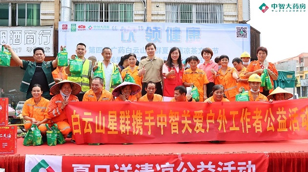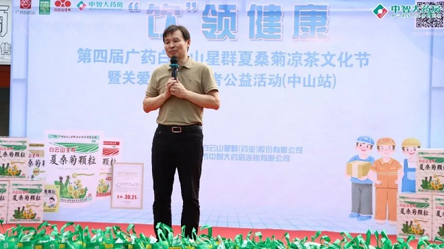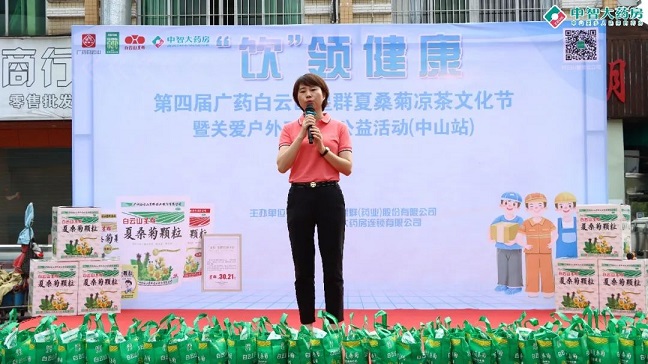 白云山星群公司總經理賀慶在臺上致辭:"涼茶作為中國傳統(tǒng)文化的一部分,在炎炎夏日,一杯涼茶不僅能消暑解渴,更能帶來心靈的慰藉。我們白云山星群藥業(yè)將通過舉辦涼茶文化節(jié)的形式,向廣大市民普及涼茶知識,推廣健康生活方式,同時也讓戶外工作者們感受到社會的溫暖與關懷。白云山星群夏桑菊在涼茶類產品是產品的領導者,占有絕對的市場份額,白云山星群和中山中智在業(yè)務上保持著強勁的戰(zhàn)略合作伙伴關系,我們也希望能為廣大消費者提供更齊全、更專業(yè)的藥品服務。關愛環(huán)衛(wèi)工人,白云山星群藥業(yè)一直在行動,今后,我們也會聯(lián)合更多的連鎖共同開展系列公益活動,為共建和諧美好的社會盡一份力量!”