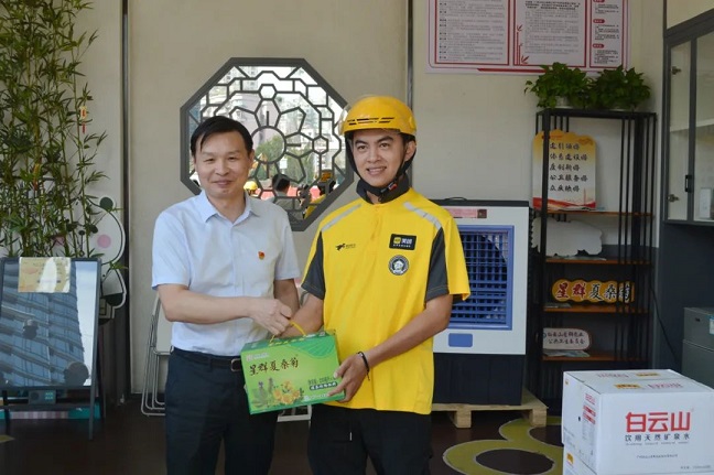 活動啟動當(dāng)天,星群公司黨委副書記、總經(jīng)理賀慶和黨委副書記、工會主席鄺敏儀帶領(lǐng)志愿者們早早地來到驛站,將準(zhǔn)備好的清涼物資分發(fā)給快遞員、環(huán)衛(wèi)工等戶外工作者,并提醒他們在高溫天氣下注意自我保護(hù),合理安排工作時間,避免中暑。不少收到物資的戶外工作人員紛紛表示感謝,稱贊這是“清涼及時雨”。