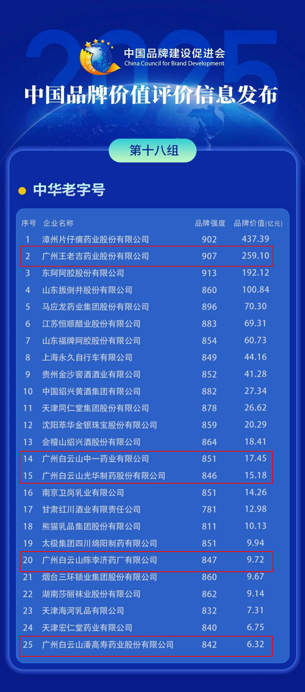 作為世界500強(qiáng)企業(yè)廣藥集團(tuán)旗下上市公司,廣藥白云山擁有13家中華老字號(hào),其中11家已超百年歷史。在活動(dòng)現(xiàn)場(chǎng),2025中國品牌價(jià)值評(píng)價(jià)信息中華老字號(hào)品牌榜單同步發(fā)布。其中,廣藥白云山旗下王老吉藥業(yè)、白云山中一、白云山光華、白云山陳李濟(jì)、白云山潘高壽榮登中華老字號(hào)品牌榜,進(jìn)入榜單25強(qiáng)。