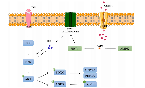 圖為夏桑菊促進糖原代謝的作用機制:通過激活A(yù)MPK通路、改善氧化應(yīng)激、增強PI3K/AKT胰島素信號傳導(dǎo)及提升肝糖原合成能力,從而改善肝臟胰島素抵抗并治療2型糖尿病。