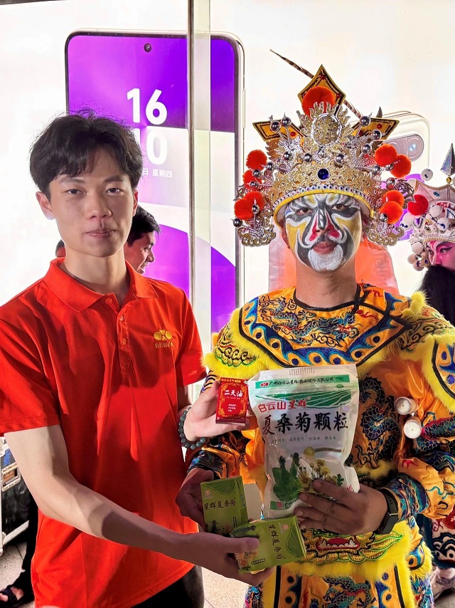 星群夏桑菊制作技藝的配方源自清代《溫病條辨》“桑菊飲”,歷經百年,方劑加減化裁,劑型由傳統(tǒng)湯劑到片劑再到如今便于攜帶沖泡引用的顆粒劑型,不僅能清肝明目還能緩解表演勞累與燥熱;創(chuàng)制于1915年的二天油制作技藝,其滴水成珠的傳統(tǒng)黑油提煉標準傳承至今,提神醒腦的功效為表演者注入持續(xù)活力。讓中醫(yī)藥非遺與民俗非遺完成了一次溫暖對話。
