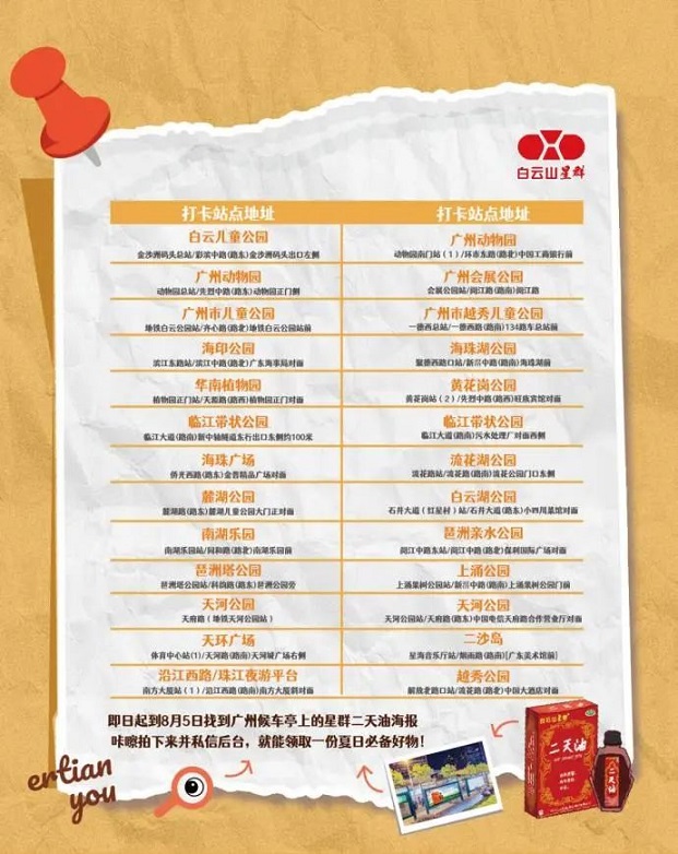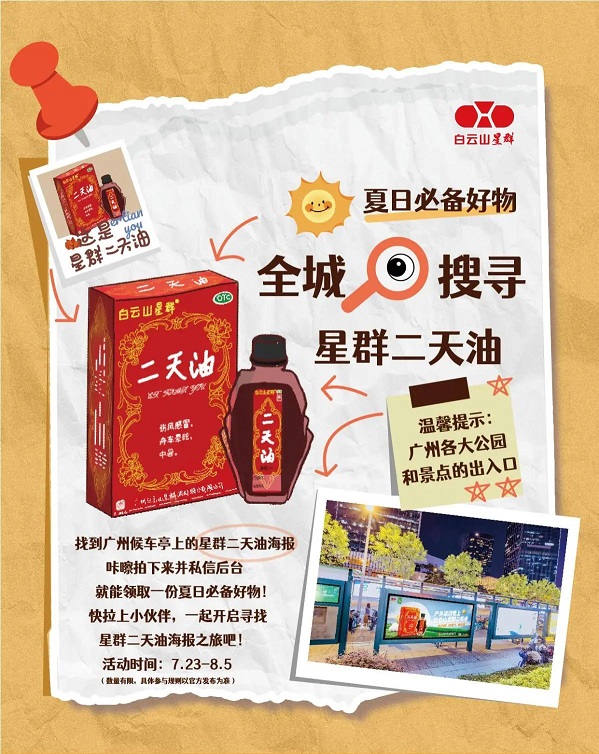 在廣州,公園是市民日常散步、鍛煉、休閑的熱門去處??紤]到戶外活動時人員相對集中,蚊蟲叮咬風險較高,白云山星群精準發(fā)力,在廣州 24 個公園、景區(qū)出入口的候車亭投放了醒目的廣告。當市民準備入園開啟休閑時光,或是到景點游玩觀光時,都能一眼看到這些廣告。廣告?zhèn)鬟f的核心信息清晰明確 —— 戶外出行,記得帶上星群二天油。二天油作為白云山星群的特色草本產品,依托薄荷腦、薄荷油、冰片及由梔子、艾葉、血竭提煉制成黑油的復合配方,形成驅蚊防護網,在一定程度上抵御蚊蟲侵擾,幫助市民減少被蚊子叮咬的概率,從而降低感染基孔肯雅熱的風險,讓大家能在戶外盡情享受自然與陽光。