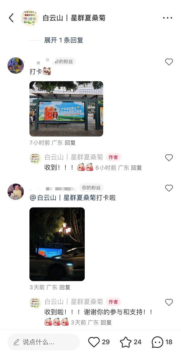 看到這些戶外廣告的市民,還能參與到有趣的線上互動中。白云山星群在小紅書同步發(fā)起了 “拍立得” 活動,在廣告投放期間,市民只要拍下公園候車亭的星群二天油廣告,發(fā)布到白云山星群夏桑菊小紅書官方賬號,就有機會獲得一份防蚊禮包。這樣的互動活動,讓市民在出行途中既能收獲健康提示,又有機會贏取福利,受到不少人的關注。