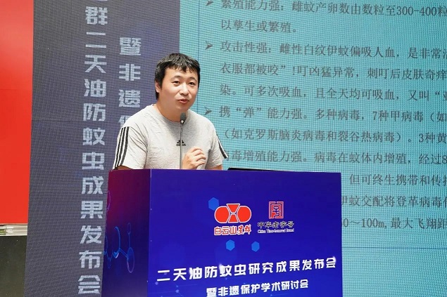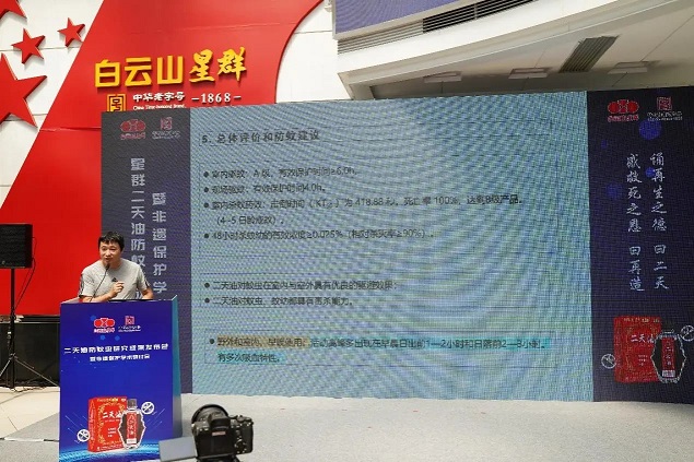 毛潤乾團隊成員陳大嵩博士為與會嘉賓重點講解了《二天油防蚊叮咬成果報告》,毛潤乾團隊實驗研究顯示,在二天油室內(nèi)驅(qū)蚊藥效試驗中,星群嚴格參照國標GB/T 13917.9-2009測試,證明在涂抹1.5µl/cm²星群二天油,能對傳播基孔肯雅熱與登革熱的“元兇”——白紋伊蚊形成長達6小時的強力驅(qū)避;而依據(jù)國標GB/T 13917.6-2009測試,星群二天油對白紋伊蚊的致死率高達100%,KT50值(擊倒半數(shù)蚊蟲時間)僅需6.98分鐘。此外,參照國標GB/T 31711-2015測試,星群二天油實現(xiàn)48小時內(nèi)殺滅90%以上的幼蟲,僅需0.025%的低濃度。
